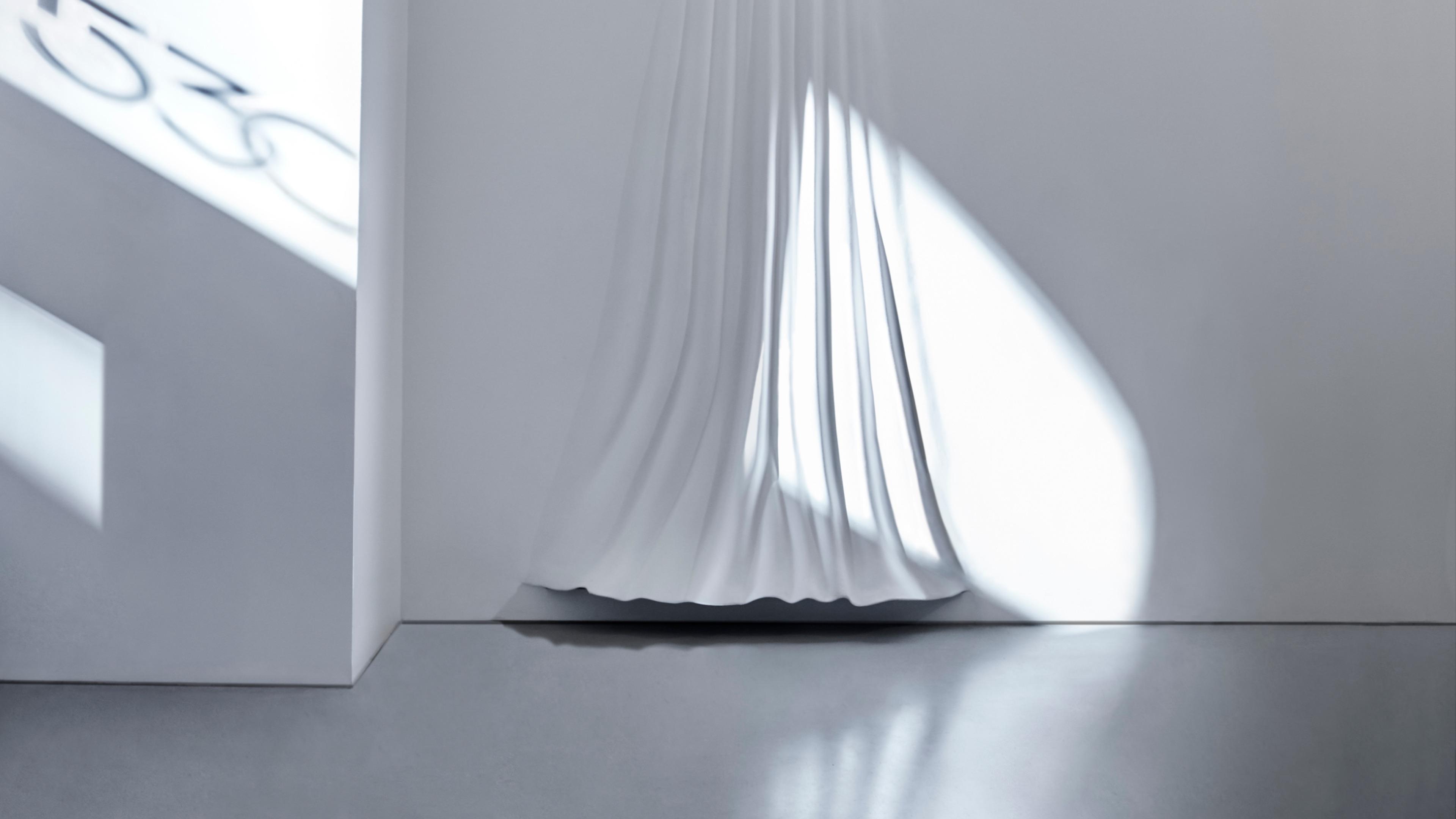 The concept is reflective of a gallery-like environment with a neutral material palette and blackened steel objects that appear to be floating in the space.